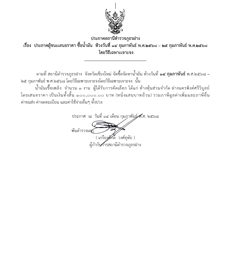 ประกาศผู้ชนะจัดซื้อวัสดุน้ำมันเชื้อเพลิงกิจกรรมการบังคับใช้กฎหมายอำนวยความยุติธรรมและบริการประชาชน (14 – 25 กุมภาพันธ์ 2568)