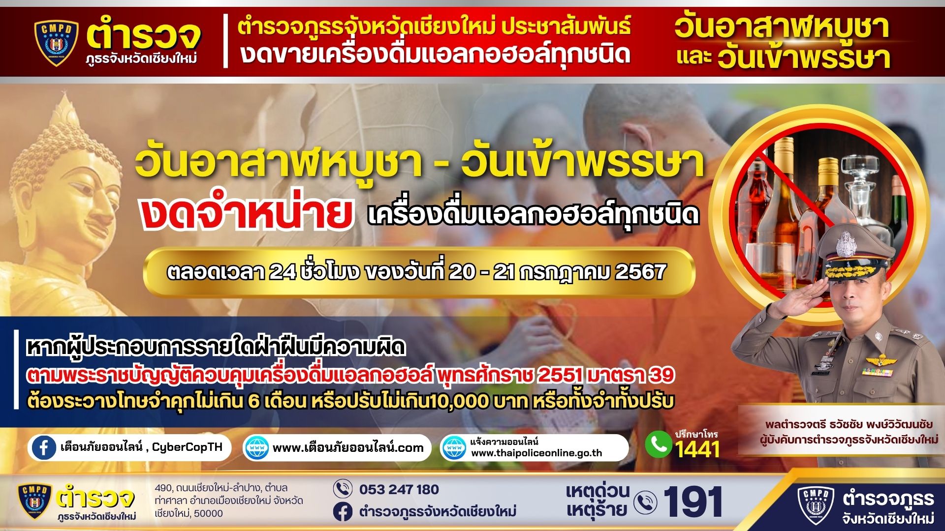 ตำรวจภูธรจังหวัดเชียงใหม่ (CMPD) เตือน!!! งดจำหน่ายเครื่องดื่มแอลกอฮอล์ทุกชนิด ทั้งขายส่งและขายปลีก