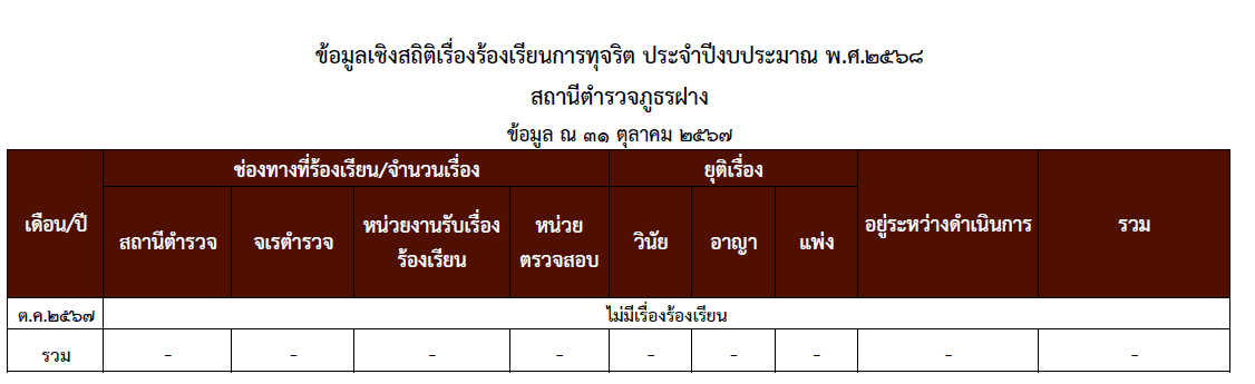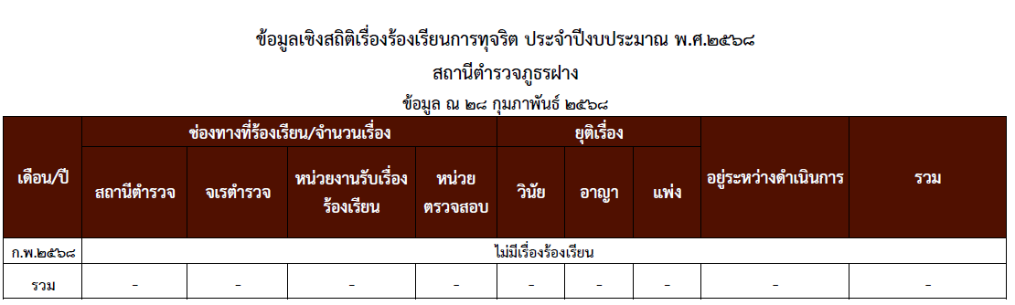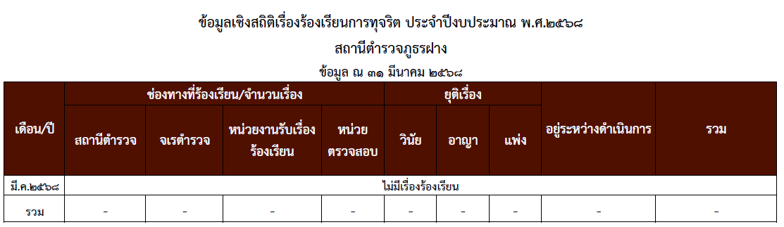 ข้อมูลเชิงสถิติเรื่องร้องเรียนการทุจริต ประจำปีงบประมาณ พ.ศ.2568 สถานีตำรวจภูธรฝาง